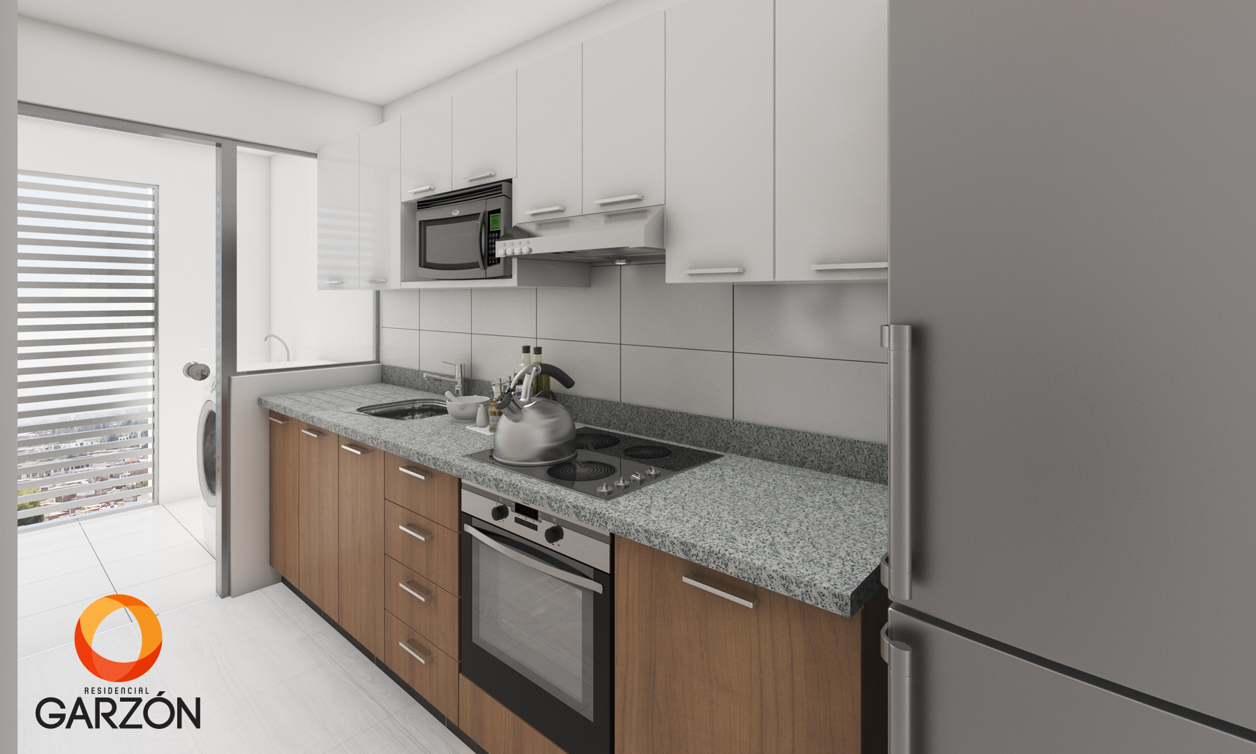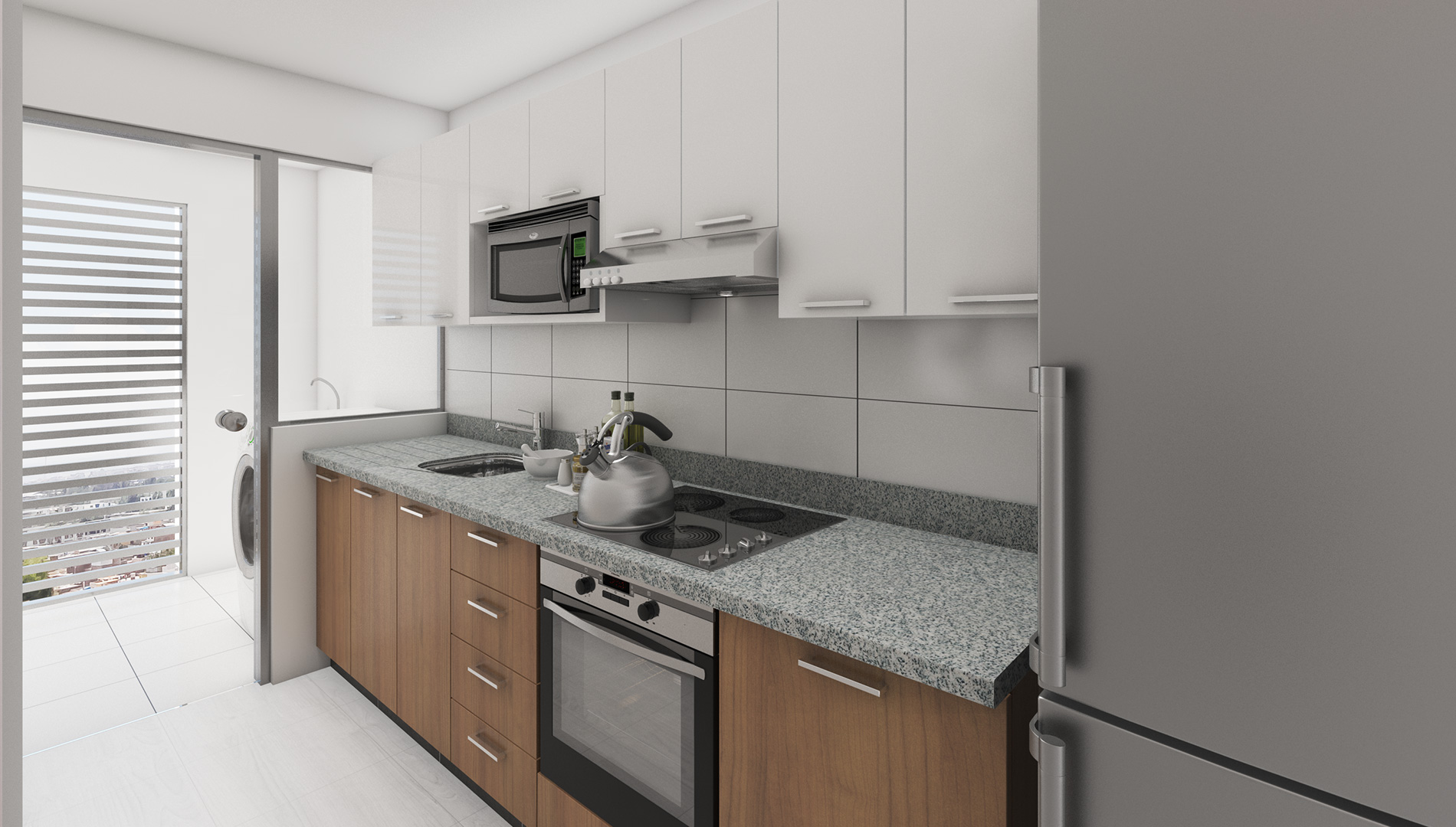 Cocinas pisos Celima Silex marmolizado beige, muebles bajos, tablero de granito, etc.