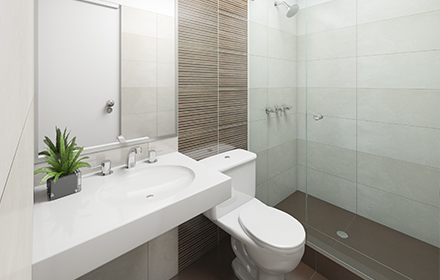 Baños pisos Celima Silex marmolizado gris, griferia Italgrif, inodoros y lavatorios Trebol.