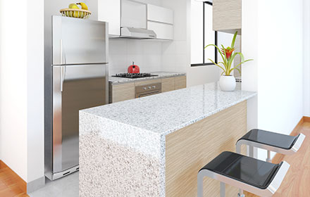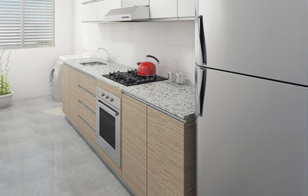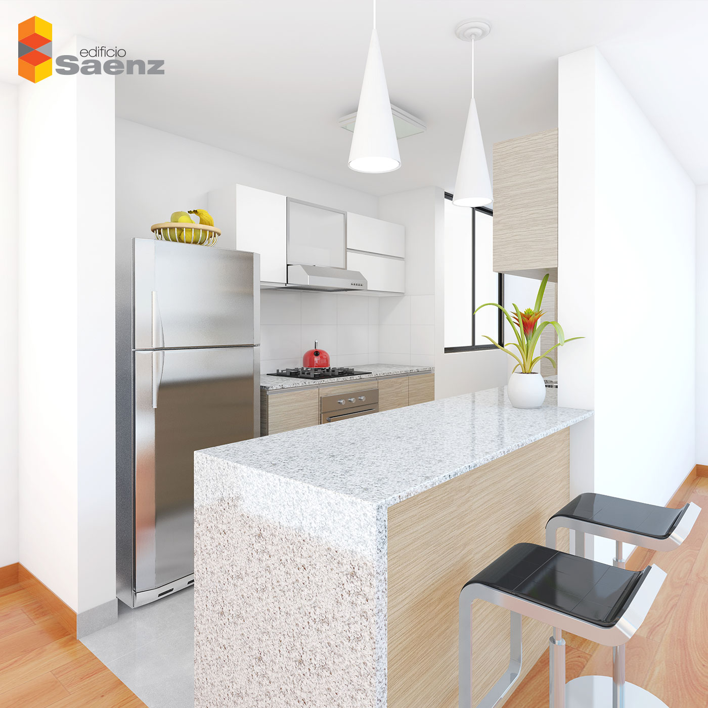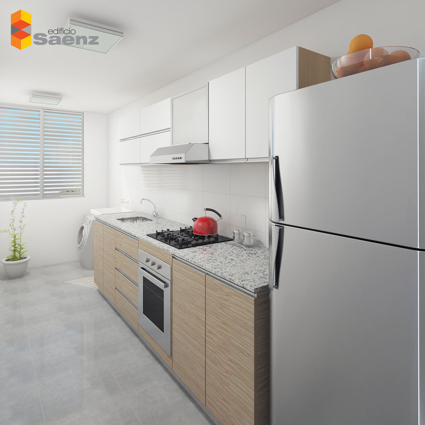 Cocinas con tableros de granito, lavadero de acero inoxidable, muebles altos y bajos, encimera, horno y campana.