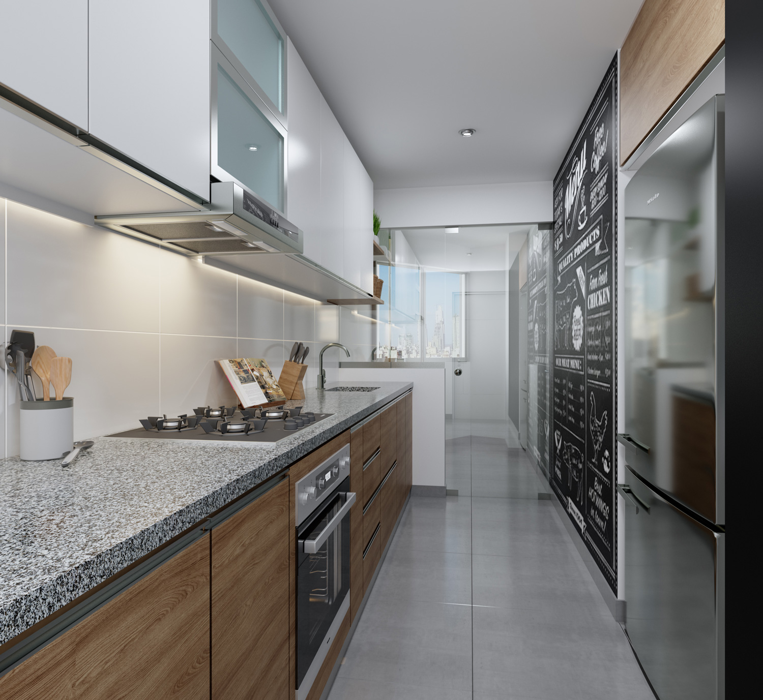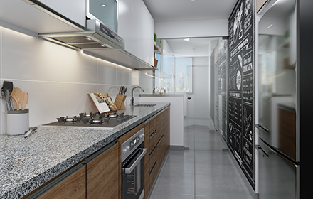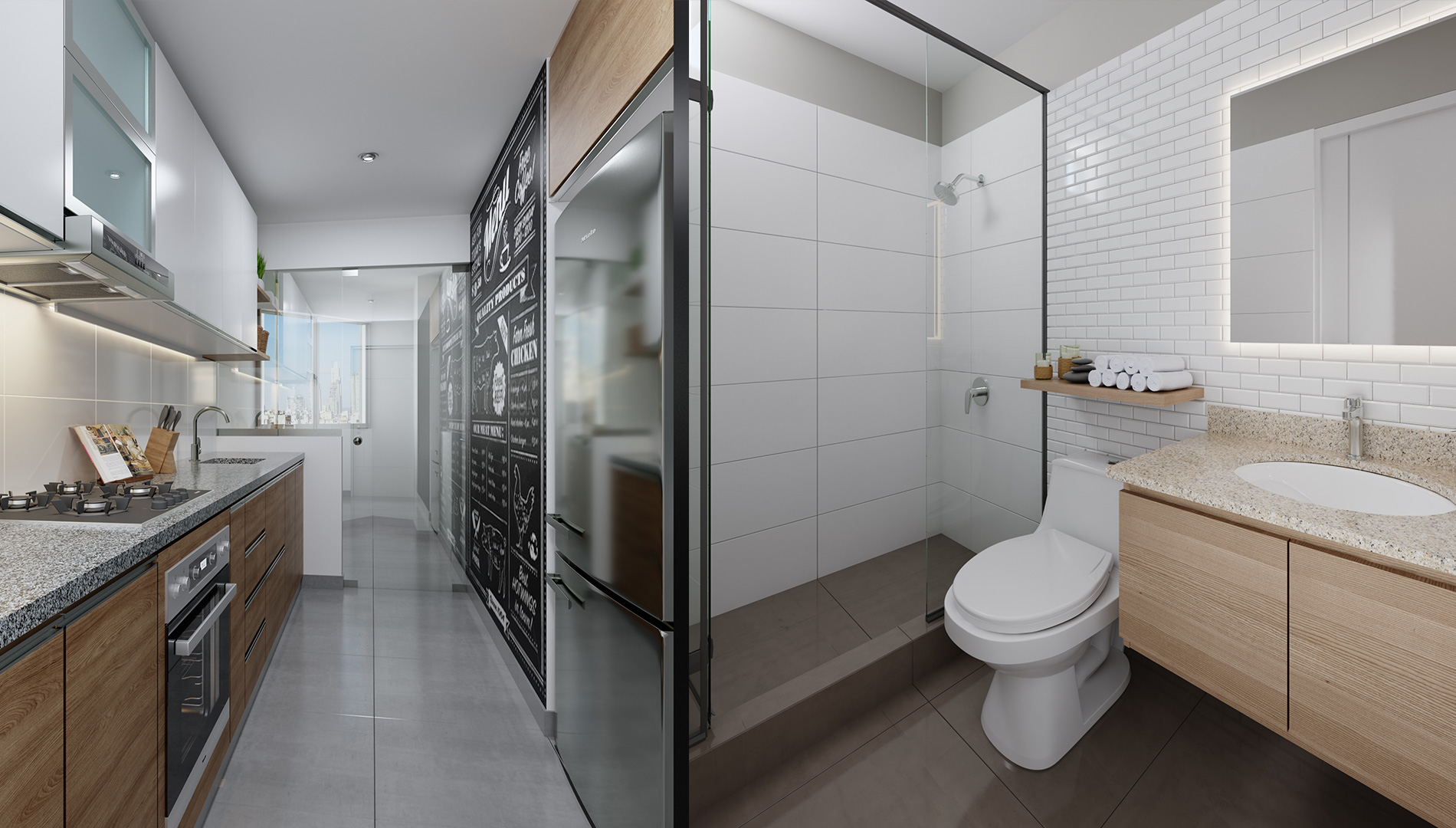 Cocinas PORCELANICO GRIS, muebles bajos, tablero de granito, etc.