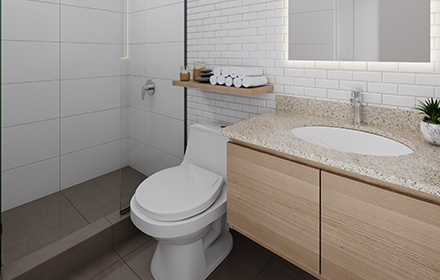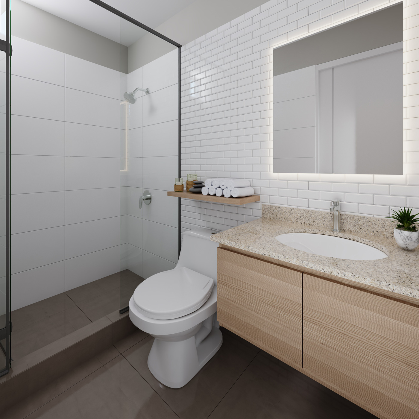 Piso de PORCELANATO COLOR MARRÓN SEMIBRILLANTE, griferia , inodoros y lavatorios .
