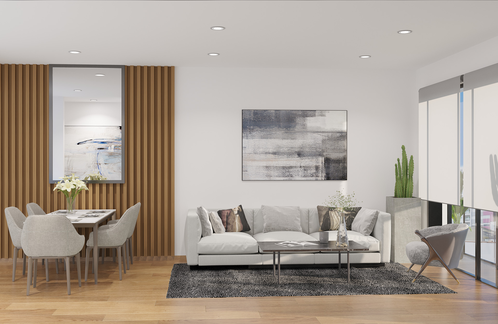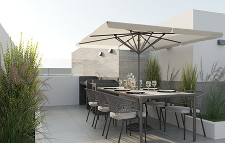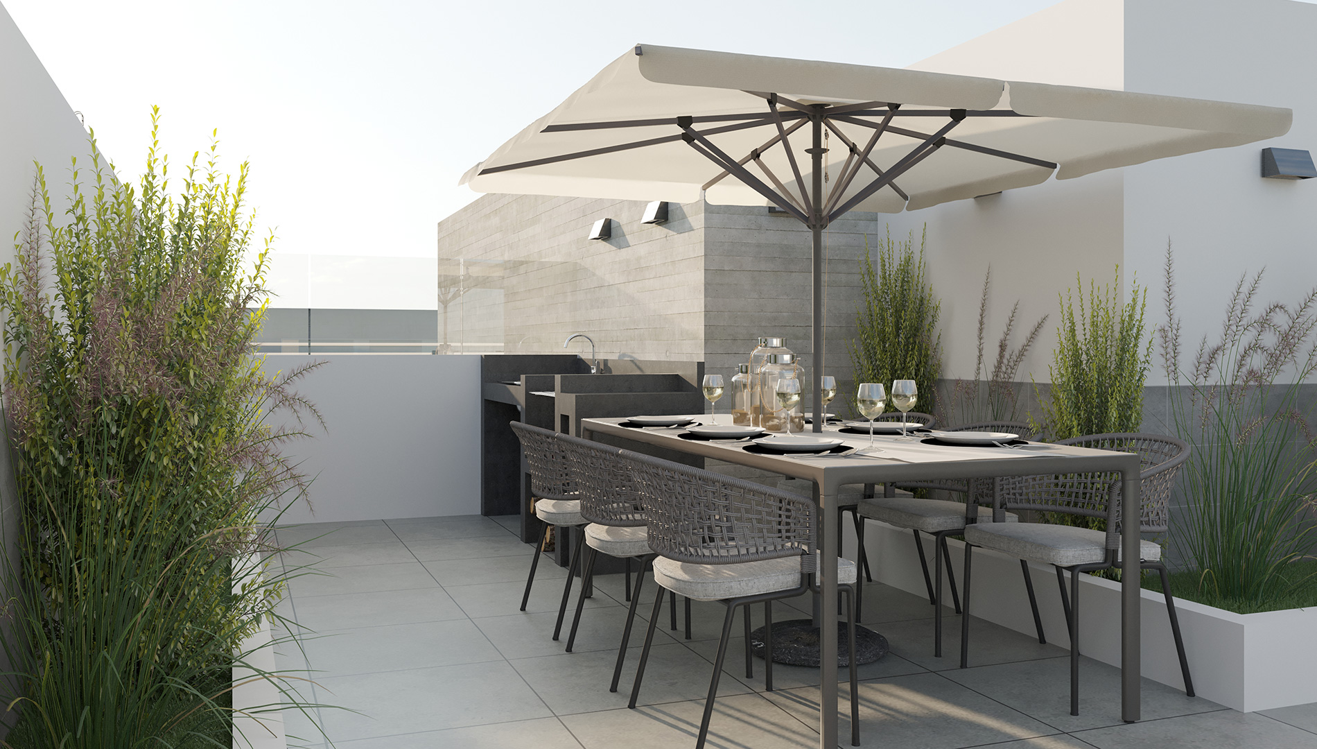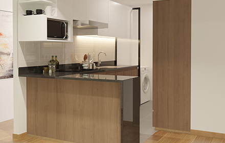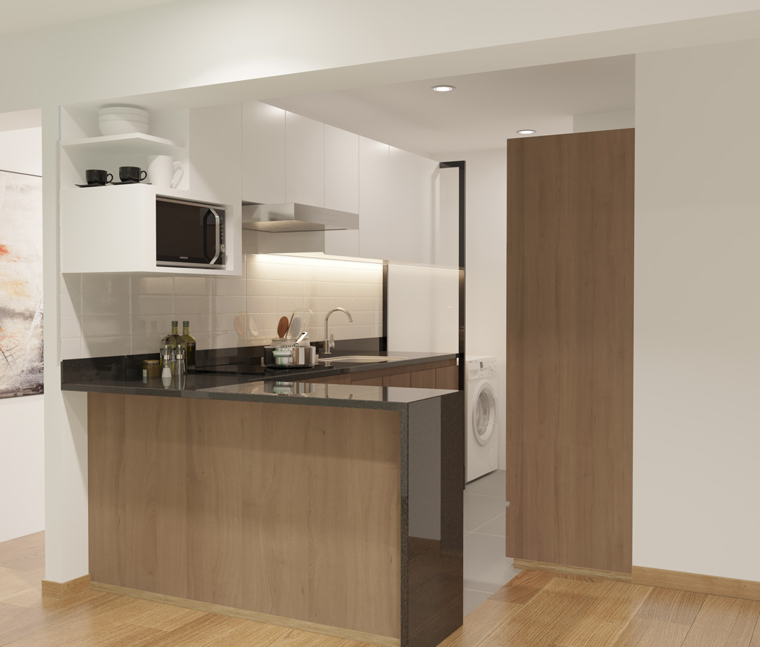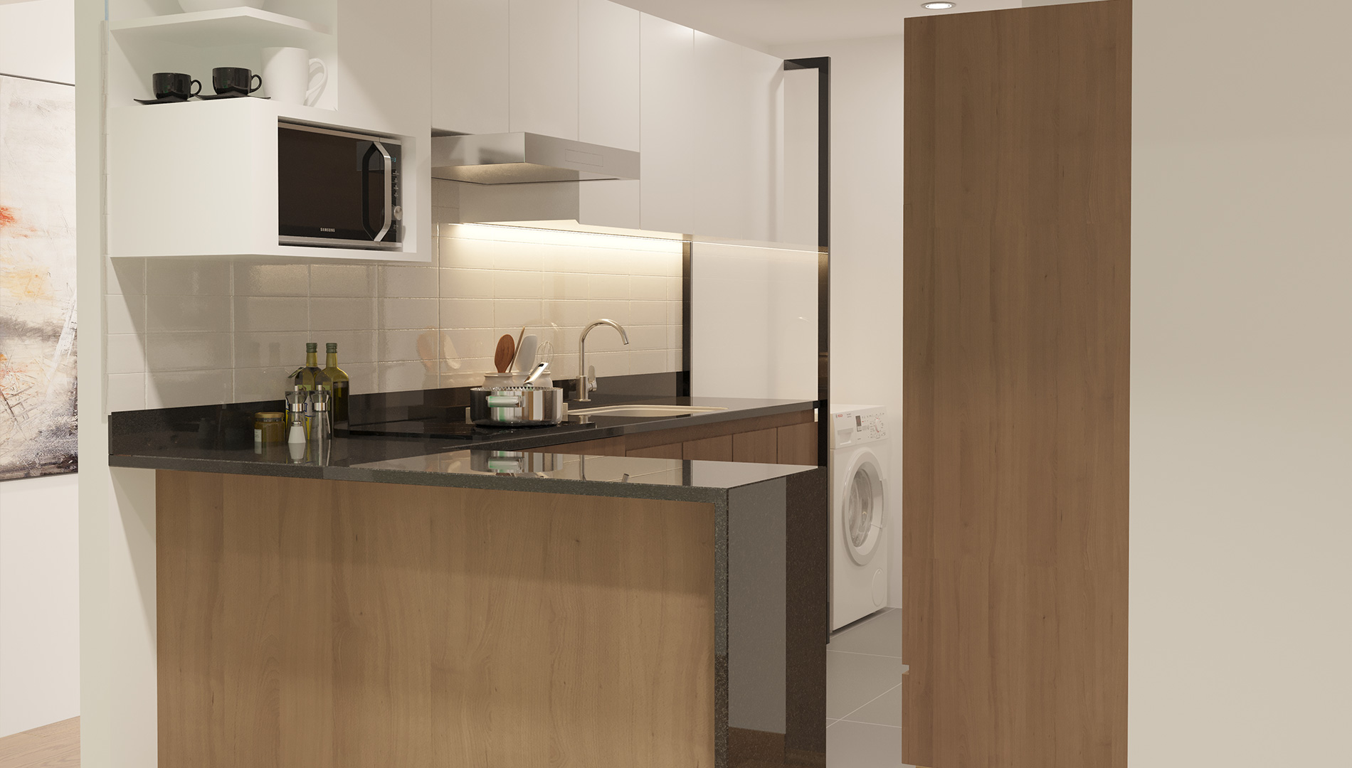 Cocinas PORCELANICO GRIS, muebles bajos, tablero de granito, etc.