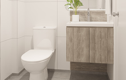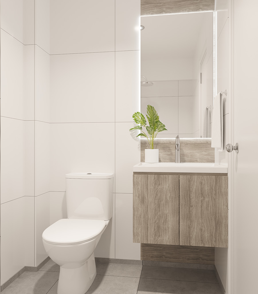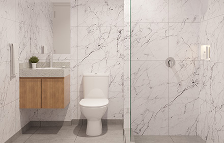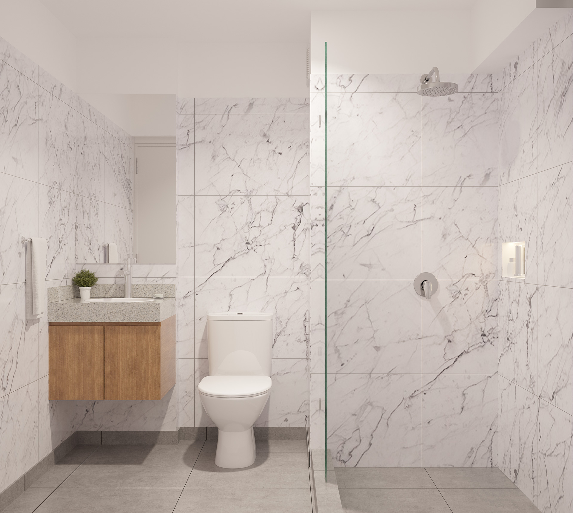 Piso de PORCELANATO COLOR MARRÓN SEMIBRILLANTE, griferia, inodoros y lavatorios.